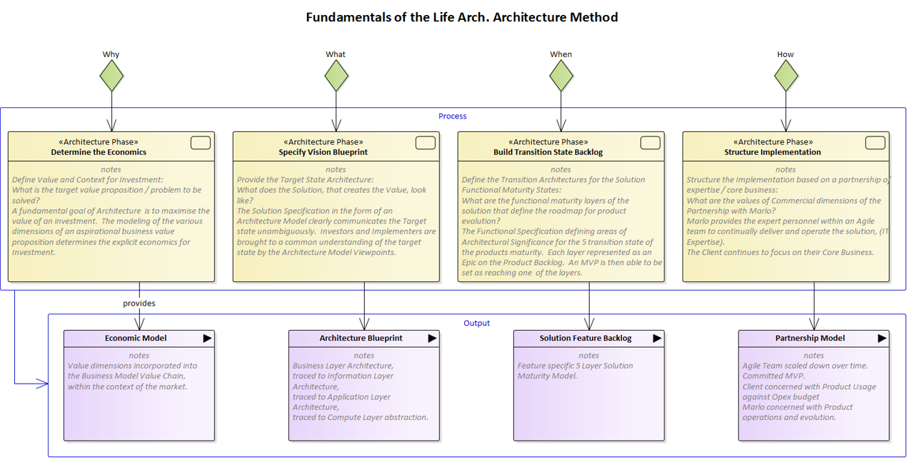 The Architecture process specifies the sequence of activities and deliverables that are used to deliver a specific Architecture. This viewpoint describes the fundamentals of the Life Architecture Method that drives stakeholder engagement and Solution Economics.